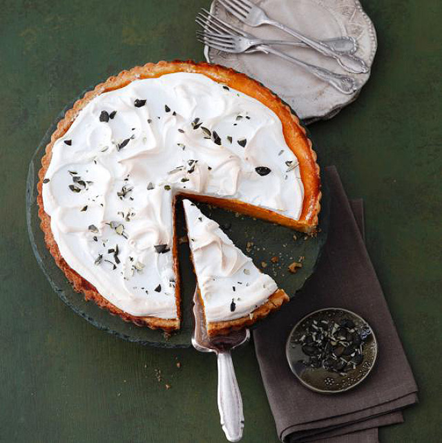 Das Eiweiß mit 1 Tl Zitronensaft und 1 Prise Salz steif schlagen. Nach und nach 100 g Zucker und 75 g Puderzucker einrieseln lassen. Weiterschlagen, bis sich beim Herausziehen der Rührstäbe Spitzen bilden. Kürbistarte aus dem Ofen holen und etwa 10 Minuten abkühlen lassen. Baisermasse auf der Tarte verteilen und mit Kürbiskernen bestreuen. 17-20 Minuten backen, bis das Baiser leicht gebräunt ist. Auf einem Kuchengitter abkühlen lassen.